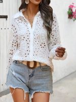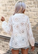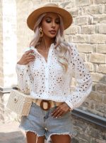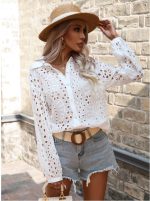 Luce fresca y femenina con esta encantadora blusa confeccionada en algodón. Su diseño incluye escote en V tanto en la parte delantera como posterior, realzado con delicado textil tipo ojalillo que aporta un toque de elegancia artesanal. Las mangas bombachas con recogido en los hombros y en la muñeca le dan volumen y un estilo sofisticado, ideal para combinar con jeans, faldas o pantalones de vestir.